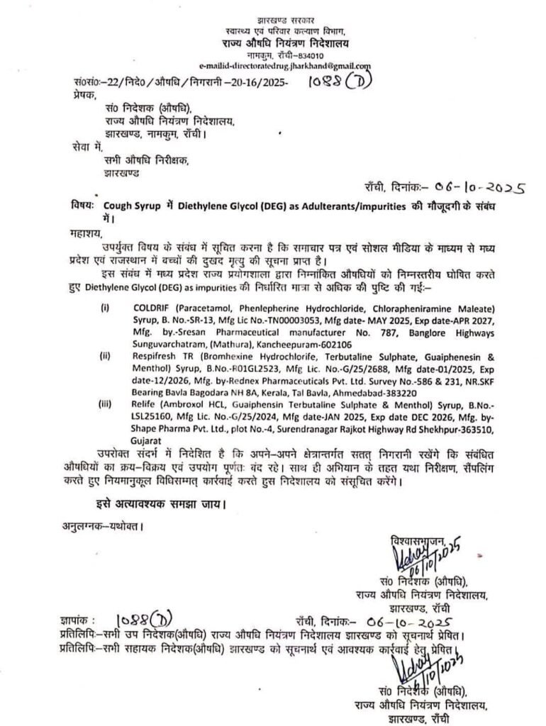 केंद्रीय स्वास्थ्य मंत्रालय से मिले निर्देशों के आधार पर राज्य औषधि नियंत्रण निदेशालय, झारखंड ने इन तीनों दवाओं पर रोक लगाने संबंधी अधिसूचना जारी की है। अधिसूचना के अनुसार, राज्य के सभी जिला औषधि नियंत्रकों और दवा निरीक्षकों को आदेश दिया गया है कि वे संबंधित कंपनियों और दवा दुकानों से इन सिरप के नमूने लेकर प्रयोगशाला में जांच कराएं।
